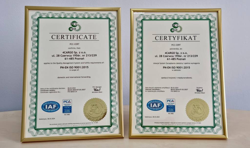 Cieszymy się ogromnie, że 4CARGO właśnie uzyskało certyfikat ISO 9001:2015! To krok naprzód, który potwierdza nasze zaangażowanie w doskonalenie jakości naszych produktów oraz usług. ISO